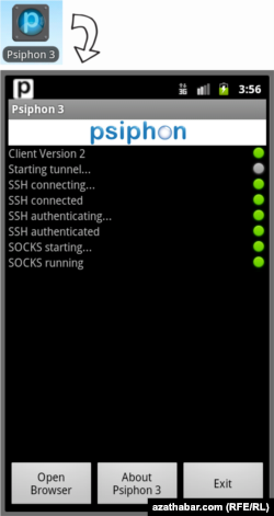 Ýaşyl reňkli kiçi belgi görkezileninde Psiphon serwerine birikme amala aşyrylýar. VPN rejesinde gelýän we gidýän mazmun awtomatiki usulda tutuşlygyna Psiphon 3 arkaly alnyp barylýar.
